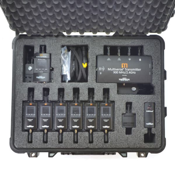 The Multiverse Studio Kit provides all the tools lighting technicians need to quickly plan, setup, and operate wireless DMX/RDM on set. Each Multiverse Studio Kit includes: